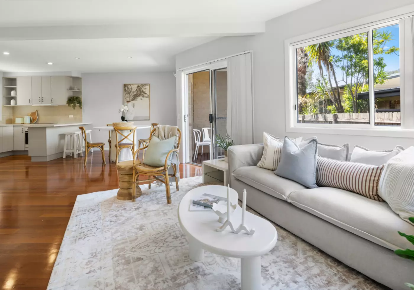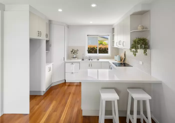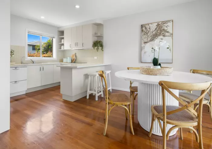 Step through the foyer and onto gleaming Australian hardwood timber floors, where you'll find a spacious open-plan living and dining area, complete with split system air conditioning for year-round comfort. The modern kitchen is well-appointed and ideal for home cooks or entertainers, seamlessly overlooking the central living space.