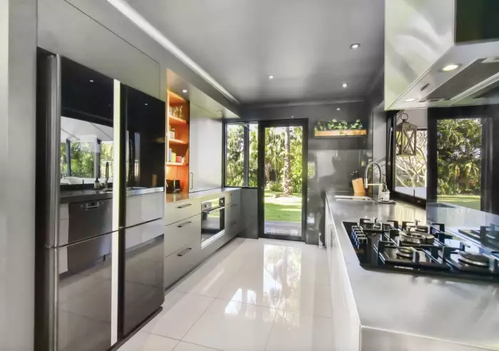A chef’s delight boasting stainless and stone benchtops, gas cooktop and electric oven, dishwasher, walk-in pantry and a servery window to the incredible poolside alfresco entertaining area — complete with inbuilt Weber BBQ and drinks fridge.