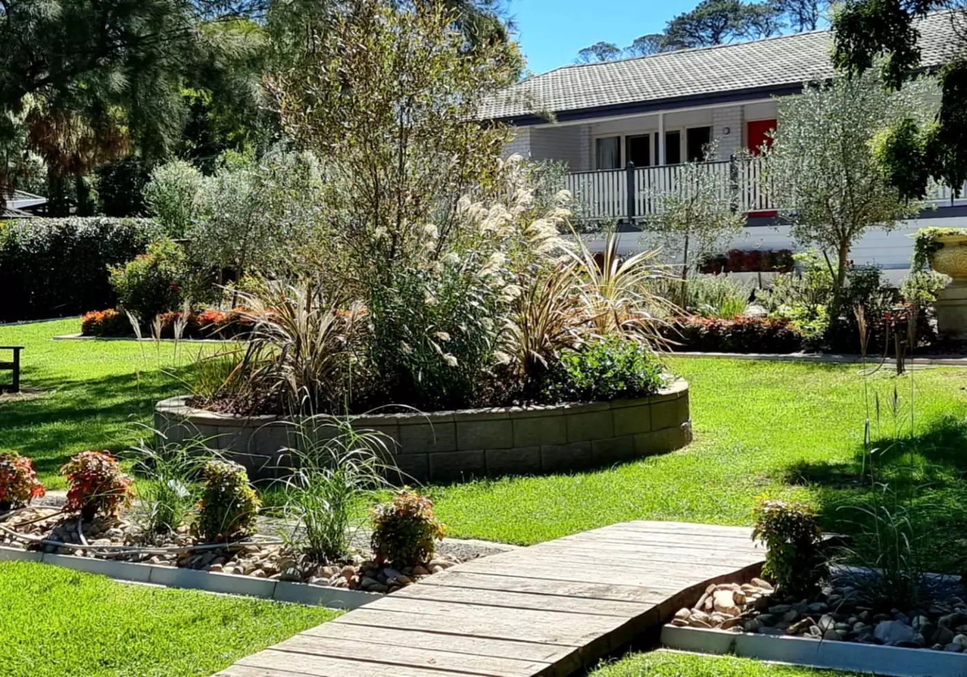 The garden has extensive above and below ground drainage which discharges into council drains. The above ground drainage of swales and a water garden has been enhanced with pebbles, plants and decorative grasses. Areas of the garden are also irrigated.