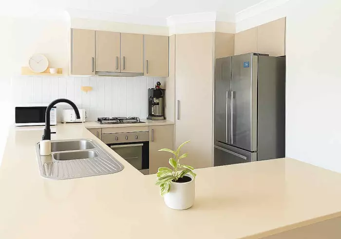 • Modern kitchen with stone benchtops and large pantry and fridge space